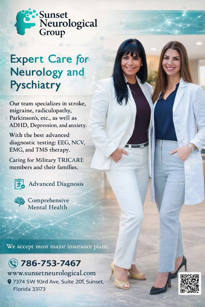 Sunset Neurological & Psychiatry Group in Miami, Florida, employs a team of highly skilled professionals who work in harmony to offer superior services to their patients. They do far more than simply relieve pain and mental anguish. The team evaluates each patient’s symptoms and identifies the source of their condition using comprehensive diagnostics and testing. They act as a treatment partner, controlling pain, preventing further injury, and guiding each patient on their individual path to recovery. Sunset Neurological & Psychiatry Group specializes in mental health and diseases of the central nervous system (brain and spinal cord). The team specializes in psychiatric and behavioral disorders, including ADHD (attention deficit hyperactivity disorder), anxiety disorders, and major depressive disorder.The practice’s board-certified psychiatrists are dedicated to providing expert evaluations and designing customized therapy plans that help patients recover and lead healthy and balanced lives.The team has specialized training in NeuroStar® TMS (transcranial magnetic stimulation) therapy to treat major depressive disorder in adults who fail to improve satisfactorily with antidepressant medication.Neurological conditions (those affecting the brain and spinal cord) that Sunset Neurological & Psychiatry Group diagnoses and treats include dementia, seizure disorders and epilepsy, multiple sclerosis (MS), stroke, and vertigo.They also treat various peripheral nerve disorders like carpal tunnel syndrome and chronic inflammatory demyelinating polyneuropathy (CIDP), nerve root injury and plexus disorders, and radiculopathy. Patients with severe migraines can benefit from Botox® injections.With Sunset Neurological & Psychiatry Group’s help, patients suffering from insomnia can get a good night’s sleep again.To experience the exceptional care and expertise delivered by the Sunset Neurological & Psychiatry Group team, call their office today.